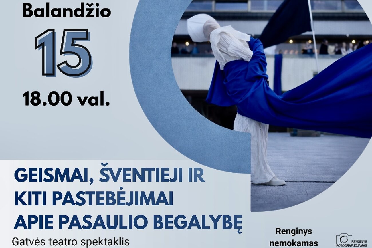 „Geismai, šventieji ir kiti pastebėjimai apie pasaulio begalybę” balandžio 15 d., 18.00 val., prie Prienų kultūros ir laisvalaikio centro. Nemokama. Spektaklio sklaidą finansuoja Lietuvos kultūros taryba.