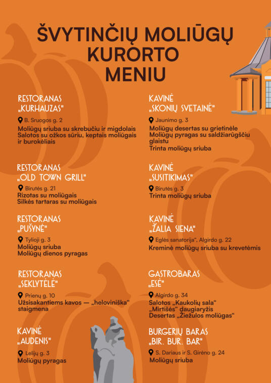 Birštono kavinėse ir restoranuose – ypatinga dedikacija moliūgų patiekalams: nuo gėrimų iki desertų. Restoranas „Old Town Grill“ pasiūlys skanauti rizotą ir silkės tartarą, kuriuos išradingai papildys ši daržovė, „Skonių svetainė“ savo lankytojus pamalonins moliūgų desertu su grietinėle ir išskirtiniu moliūgų pyragu su saldžiarūgščiu padažu, kitose kurorto kavinėse – oranžiniai skanėstai ir kvapnūs šildantys gėrimai.