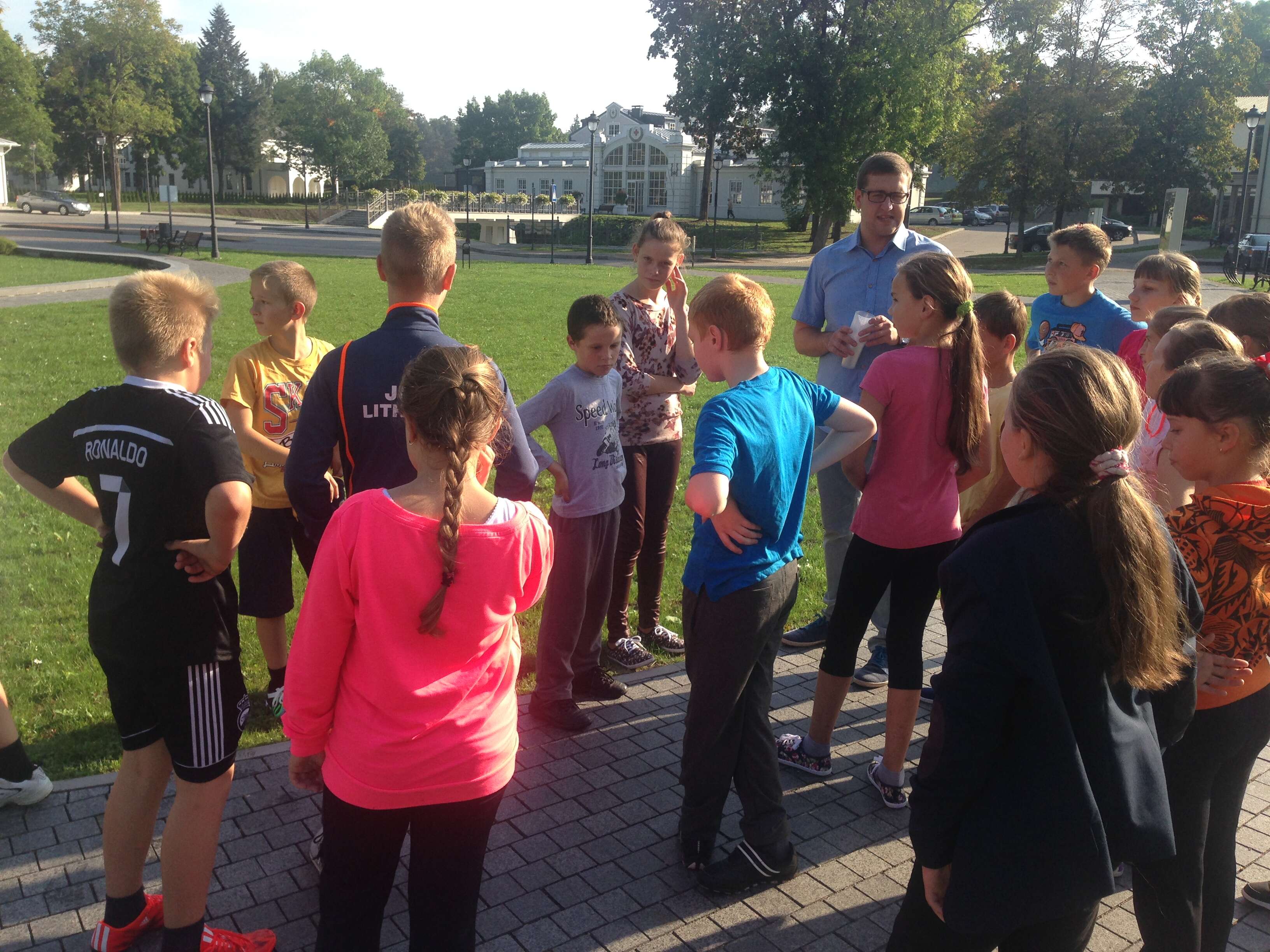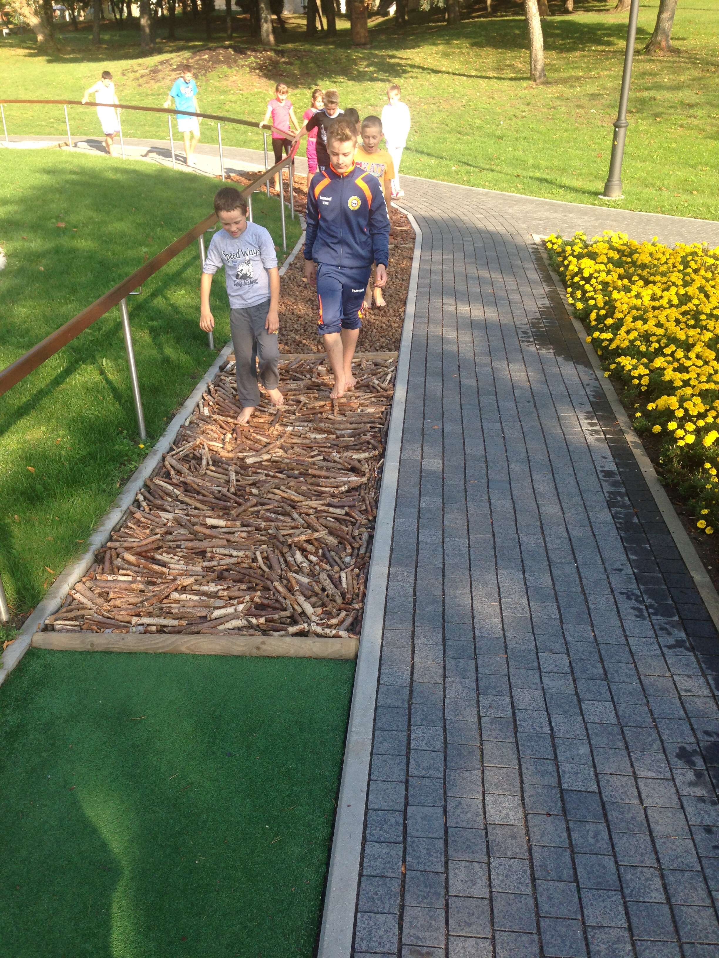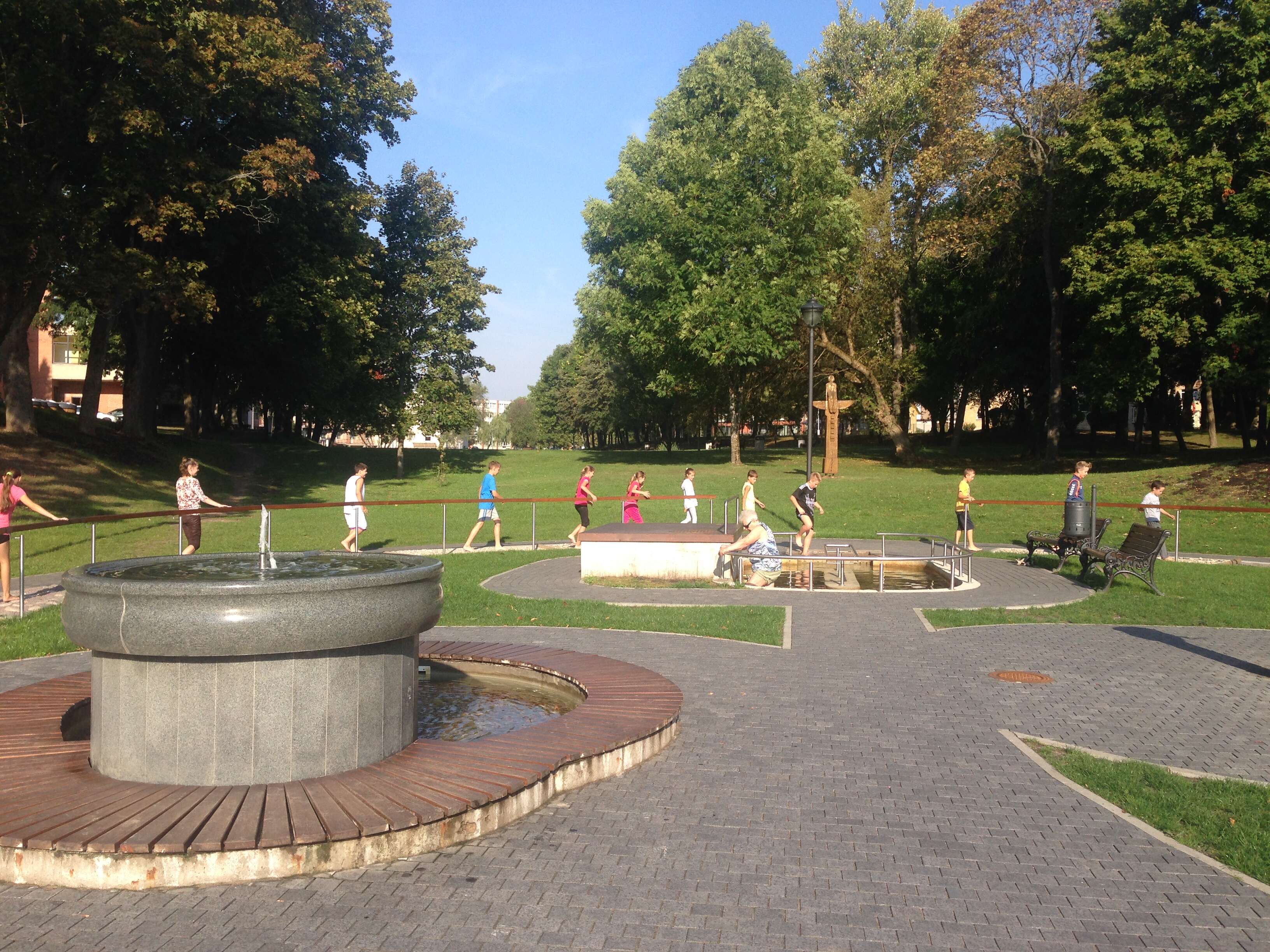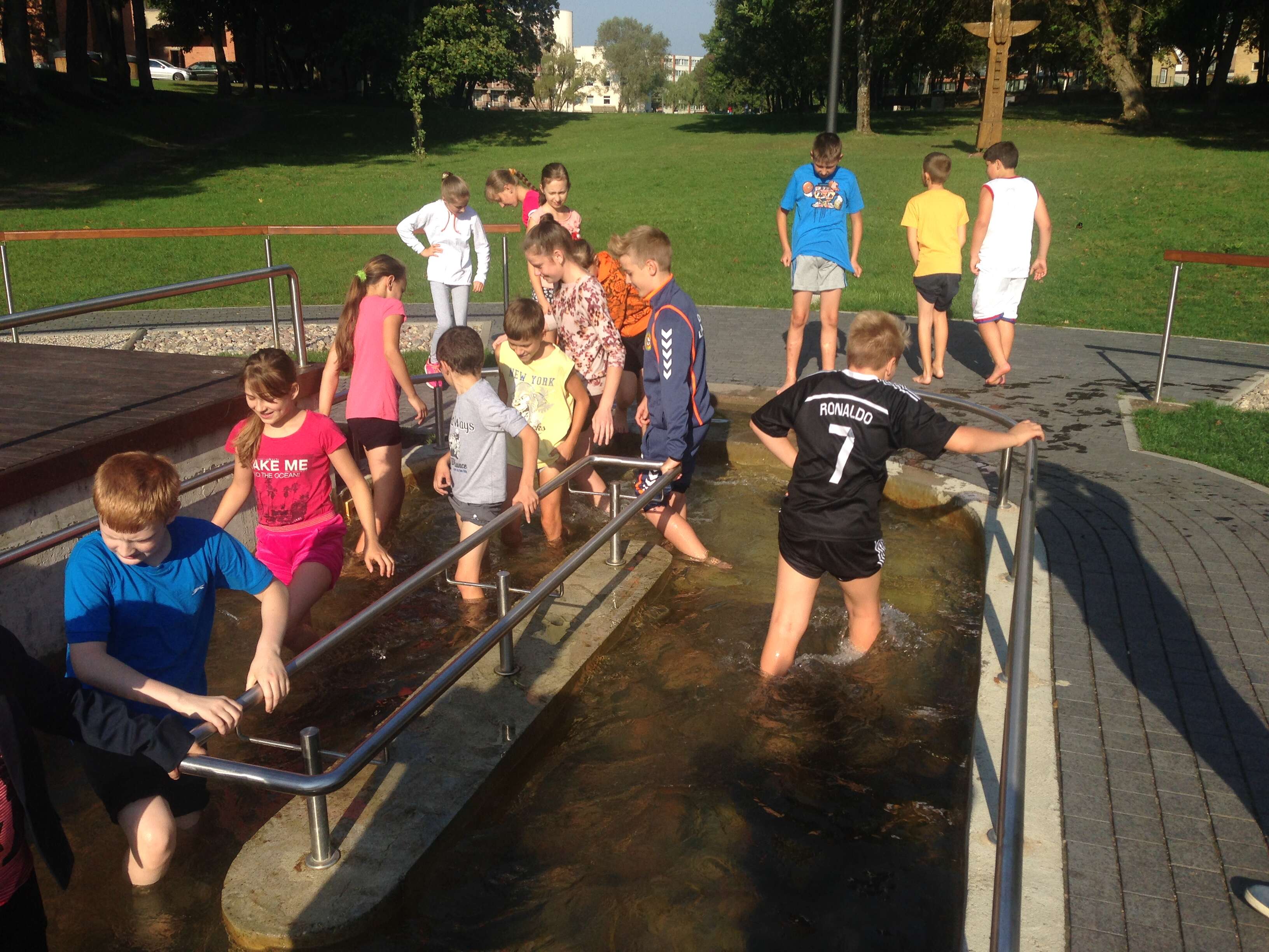 Pasinaudodami geru ketvirtadienio oru Birštono gimnazijos penktokai ir šeštokai su kūno kultūros mokytoju Arnoldu Juozaičiu bei padedant Turizmo informacijos centro darbuotojui Karoliui Rutkauskui, supažindino mokinius su Kneipo terapijos istorija, raida, naudojimu ir nauda organizmui.