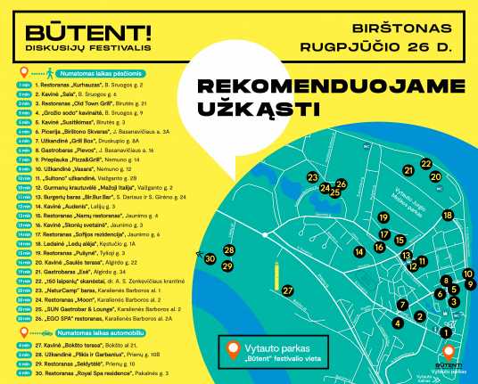 Rugpjūčio 26 d., šeštadienį, Birštone karaliaus vienintelis Lietuvoje diskusijų festivalis „Būtent!”. Šiųmetės diskusijų temos įvairios kaip ir pats kurortas: nuo dirbtinio intelekto iššūkių iki ateities maisto alternatyvų. Šalia įtraukių diskusijų vyks ir žaismingos veiklos suaugusiems bei vaikams, atvykusiųjų lauks ir tradicinės kurorto pramogos.
