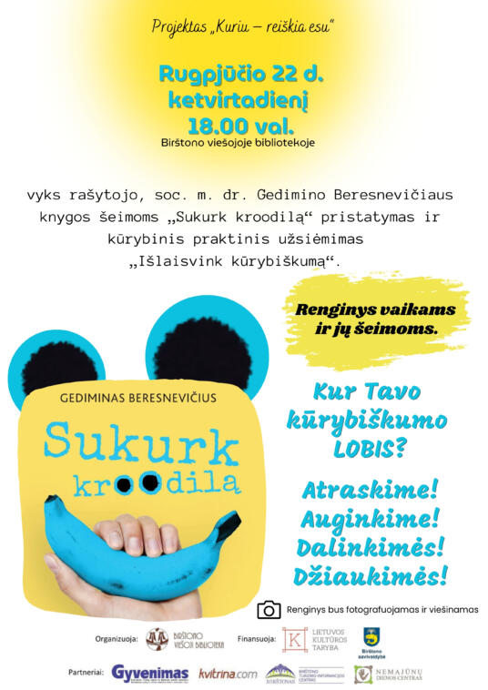 Maloniai kviečiame rugpjūčio 22 d. ketvirtadienį 18.00 val. į rašytojo, socialinių mokslų daktaro Gedimino Beresnevičiaus knygos šeimoms „Sukurk kroodilą“ pristatymą. Taip pat aptarsime, kaip ir kokie kūrybinių iššūkiai gali sprogdinti vidinio kalėjimo sienas ir išlaisvinti kūrybiškumą. Kūrybiniame praktiniame užsiėmime „Išlaisvink kūrybiškumą“ bus praktiškai išbandyti knygoje pateikti pratimai, padedantys kurti savus kroodilus, įgauti kūrybinių jėgų, užsiauginti kūrybiškumo „raumenis“, kurių reikia ne tik mokantis, dirbant, bet ir kasdienėje veikloje. Tiek vaikai, tiek suaugusieji turės galimybę pažvelgti į save ir savo aplinką naujomis akimis, pajusti, gal net atrasti viduje slypinčius kūrybiškumo lobius.