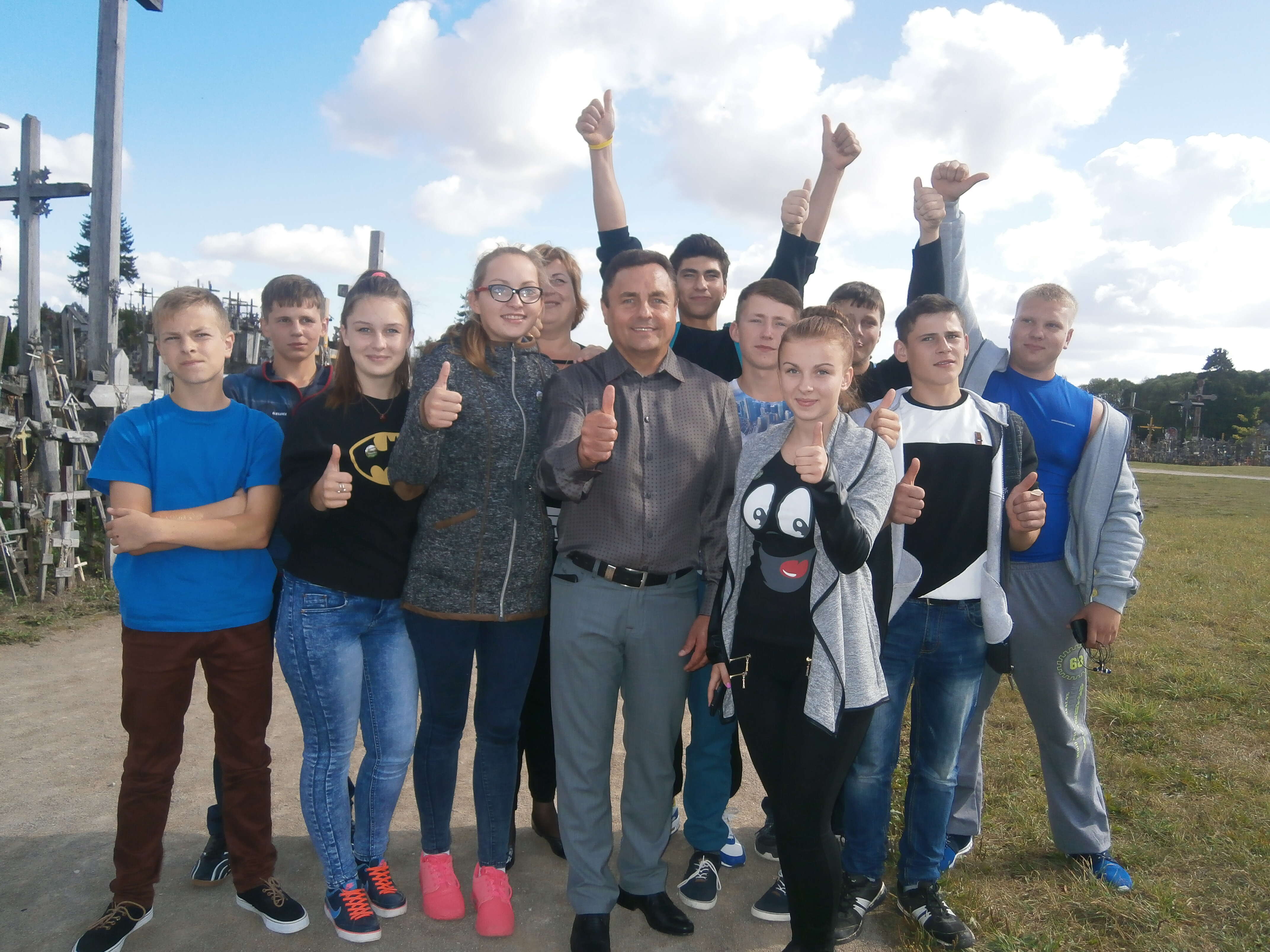 Už 7 kilometrų nuo Naisių – garsusis Kryžių kalnas. Čia mūsų laukė dar viena maloni staigmena – netikėtas susitikimas su Seimo nariu Petru Gražuliu, kuris vyko į Rygą stebėti krepšinio varžybų. Seimo narys dešimtokams padovanojo garsiuosius marškinėlius su užrašu ,,Už Lietuvą, vyrai“. Nuostabus rudeniškas oras leido pasimėgauti pasivaikščiojimu po ramybės oazę – Kryžių kalną, pabendrauti su čia sutiktais įvairių tautų, skirtingų kultūrų žmonėmis.