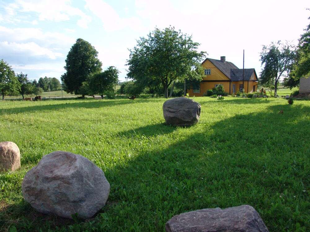Na, štai ir Stelmokų šiaudais dengti namai, bet labai patrauklūs savo senove, suolais, durimis ir mažyčiais langeliais namai. Jie – kaip senojo kaimo istorinis ženklas. Šiek tiek pakilus aukštyn Alesiaus (gyventojo vardu pavadintas) kalnas. Iš čia ryškiai matosi Jiezno ir Stakliškių bažnyčios bokštai, o ir bobutės sodyba kaip ant delno. Čia pakeliui sutinku ir pasisveikinu Aleksiunį, senyvą žmogų, bet dėl kažkokios ligos medikų nupjauta nosimi. Gal dėl to šio žmogaus ir kalbą sunkiau suprasti. Jis pasveikino su Kalėdomis visą mūsų šeimyną, aš jam atsakiau tuo pačiu.