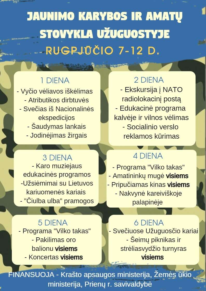Rugpjūčio 7-12 dienomis Užuguostyje vykstančios nekomercinės Jaunimo karybos ir amatų (socialinio verslo) stovyklos programa įspūdinga – nuo sukarintos programos, užsiėmimų su Lietuvos kariuomenės kariais ir amatininkais bei Žalgirio mūšio inscenizacijos, iki pakilimo oro balionu ir ypatingos dovanos iš lenktynininko Benedikto Vanago rankų.
