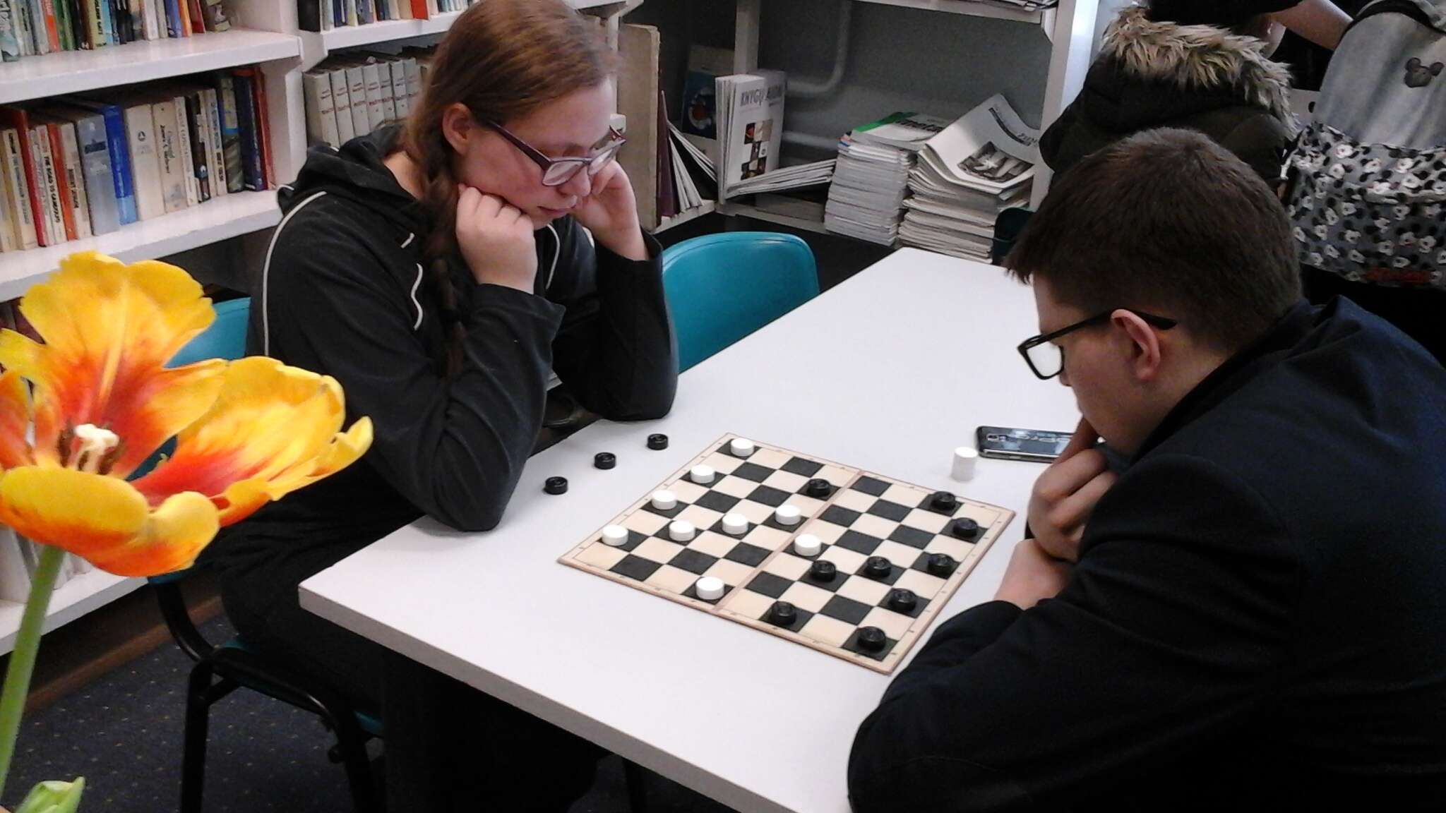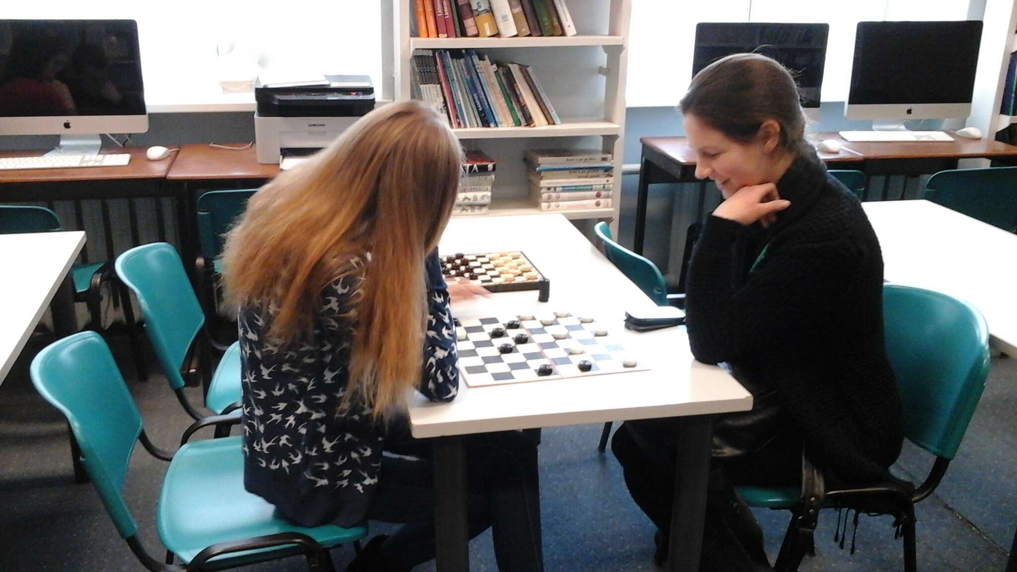 Šachmatų pusseserės šaškės taip pat nebuvo užmirštos – ilgųjų pertraukų metu visi gimnazistai galėjo varžytis jomis žaisdami. Prizininkais šį kartą tapo vaikinai: pirmoji vieta – Šarūnui Rūgiui, antroji vieta, kaip ir šachmatų žaidime, – Astijui Simanavičiui, o trečioje vietoje puikavosi Roko Gavėno vardas.