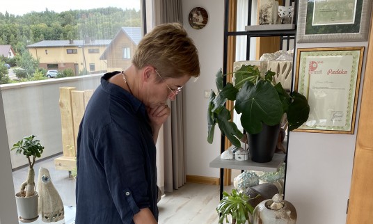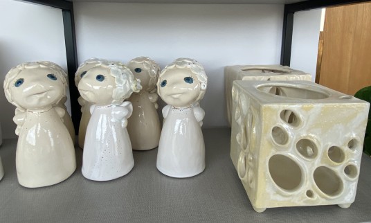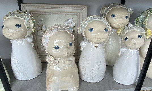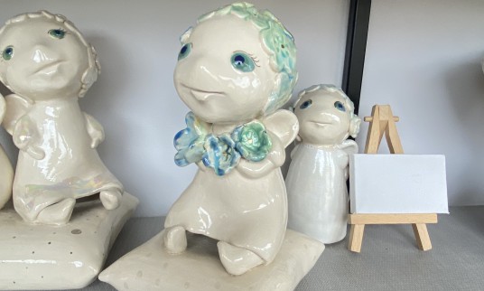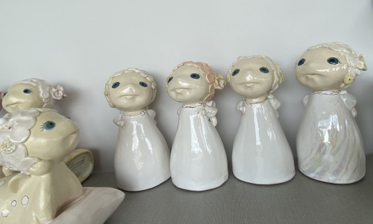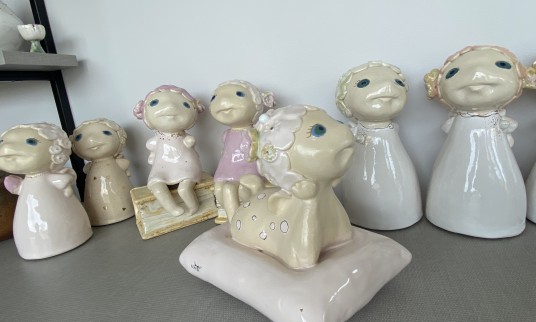 Menininkė, vedžiodama po dirbtuves, kiekvieną dirbinį glostė kaip gėlę, taip įpūsdama jiems gyvybės, kurią gali jausti tik ji. Angeliukų veideliai tokie mieli, o mažučiai vos vos išlindę sparneliai, rodės, jog pasiruošę į kiekvieno namus įpūsti meilės, santarvės, pasitikėjimo ir laimės.