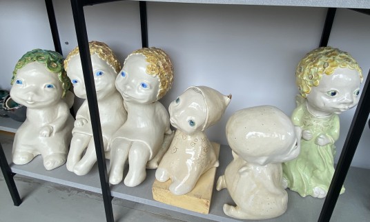 Prieš patekdama į dirbtuves, sustojau prie tapyto paveikslo, kuris buvo tarsi nuoroda, kur einu. Rytinės saulės nutviekstos dirbtuvės! Vos įžengus mane pasitiko lentynose besišypsantys nerūpestėliai, kurie laukė savo šeimininkų, o tolėliau pūpsojo kitokie meno dirbiniai. Nerūpestėliai savo šypsenas neatlygintinai dalino saulei, šeimininkei, man… Juk jie, angelai sargai, sėjantys meilę, nerūpestingos vaikystės ir vaikiško naivumo prisiminimus, kurie kaskart sako, kad gyvenime viskas taip trapu!