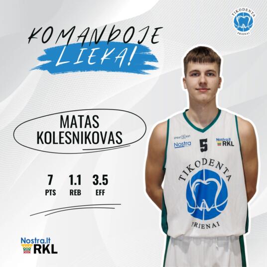 Prienų „Tikodenta“ pranešė, jog komandoje jau ketvirtą sezoną iš eilės lieka „Žalgirio“ sistemos auklėtinis Matas Kolesnikovas. Atakuojančio žaidėjo ir įžaidėjo pozicijose žaidžiantis 20-metis praeitame sezone vidutiniškai pelnydavo po 7 taškus. Jo praeito sezono rekordas – 20 taškų.