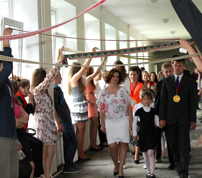 Šventinis sveikinimas prasidėjo aktų salėje, kur iškilmingai buvo sugiedotas mokyklos himnas. Mokyklos direktorė  L.Šernienė savo palinkėjimus abiturientams sudėjo į   pasaką apie gležnutį pienės pūkelį. Sveikino ir atsisveikino pirmosios mokytojos, pirmokėliai, sėkmės ir svajonių išsipildymo linkėjo vienuoliktokai. Skambėjo mokyklos choro atliekamos dainos, jo nariai taip pat prisidėjo prie dešimtokų, mokyklos tarybos narių,  draugų ir artimųjų palinkėjimų dvyliktokams.