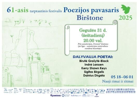 Gegužės 31 d. (šeštadienį) Birštone 20.00 val. prie sanatorijos „Versmė“ fontano (jei lis – biuvetėje) vyks  61-asis „Poezijos pavasario“ renginys. Birštone viešės poetai: Birutė Grašytė-Black, Indrė Larssen, Kerry Shawn Keys, Sigitas Birgelis. Taip pat Dainius Dirgėla – festivalio vadovas, poetas, literatūros ir kultūros ekspertas.