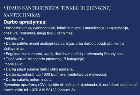 „Prienų butų ūkis“ siūlo darbą vidaus santechnikos tinklų ir įrenginių santechnikui