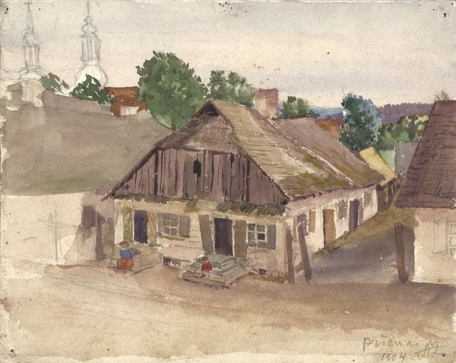 Žiemos pradžioje prieniškė Janina Leonavičienė savo Facebook‘o paskyroje pasidalino Antano Žmuidzinavičiaus akvarele su 1904 metų Prienų vaizdu.