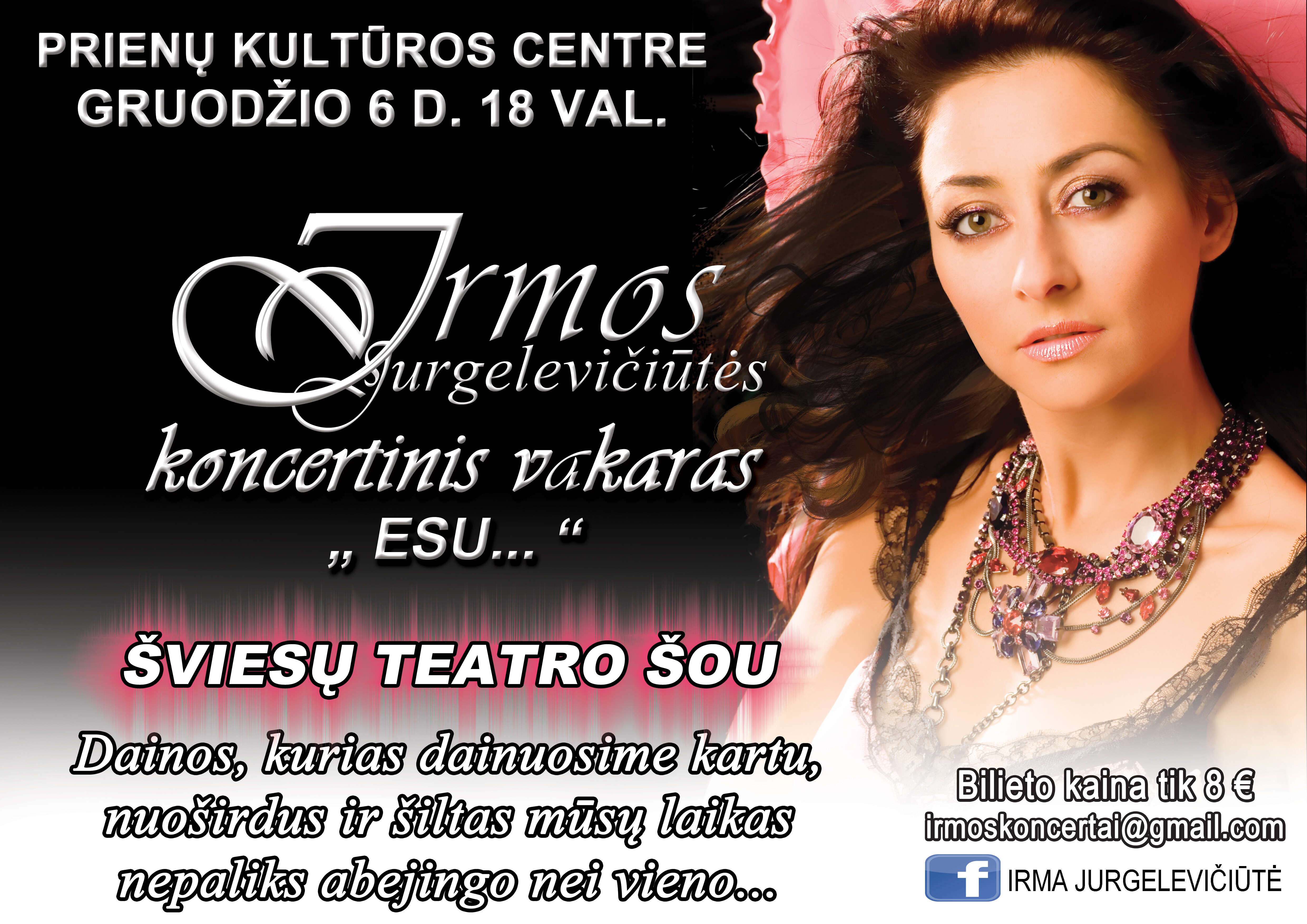 Perėjusi ugnį ir vandenį, saulę ir karštį, audras ir šaltį, patyrusi džiaugsmą ir negandas, apkeliavusi pusę pasaulio ir išlikusi tokia pati energinga, atvira, šilta POP muzikos žvaigždė Irma Jurgelevičiūtė atvyksta pas mus priminti dainas, į kurias suverti išgyvenimai ir džiaugsmingi atradimai, aistra ir kančia, ir ilgesys to, kas tikra.