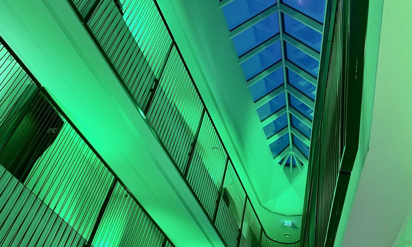Pakėlus akis į viršų žvilgsnis nukrypdavo į žalia šviesa nuspalvintus kiekvieno aukšto turėklus, laisvas erdves.